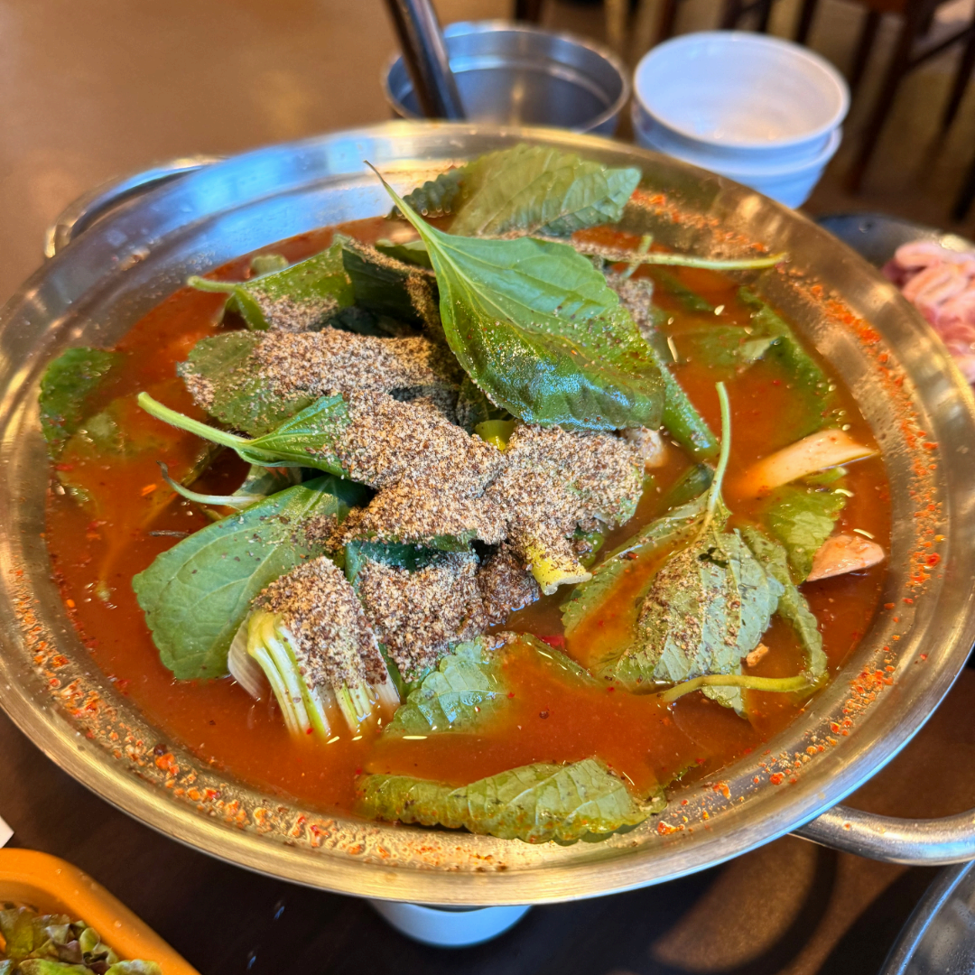 진한 붉은 국물 위로 깻잎과 들깨가 듬뿍 올라가 있고