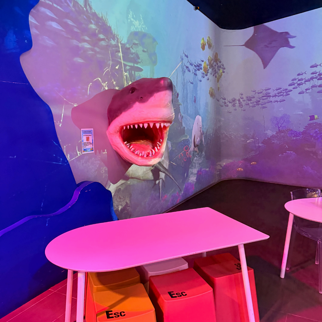입체적으로 튀어나온 상어 모형, 가오리, 해파리 그래픽이 있어요.